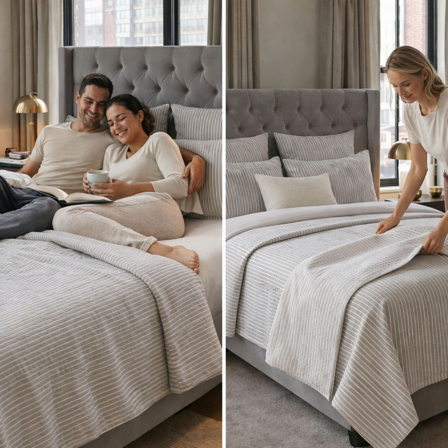 Su tejido con relieve sutil crea una apariencia moderna y refinada, mientras su peso ligero permite una caída natural que facilita el tendido de la cama y aporta frescura al descanso.