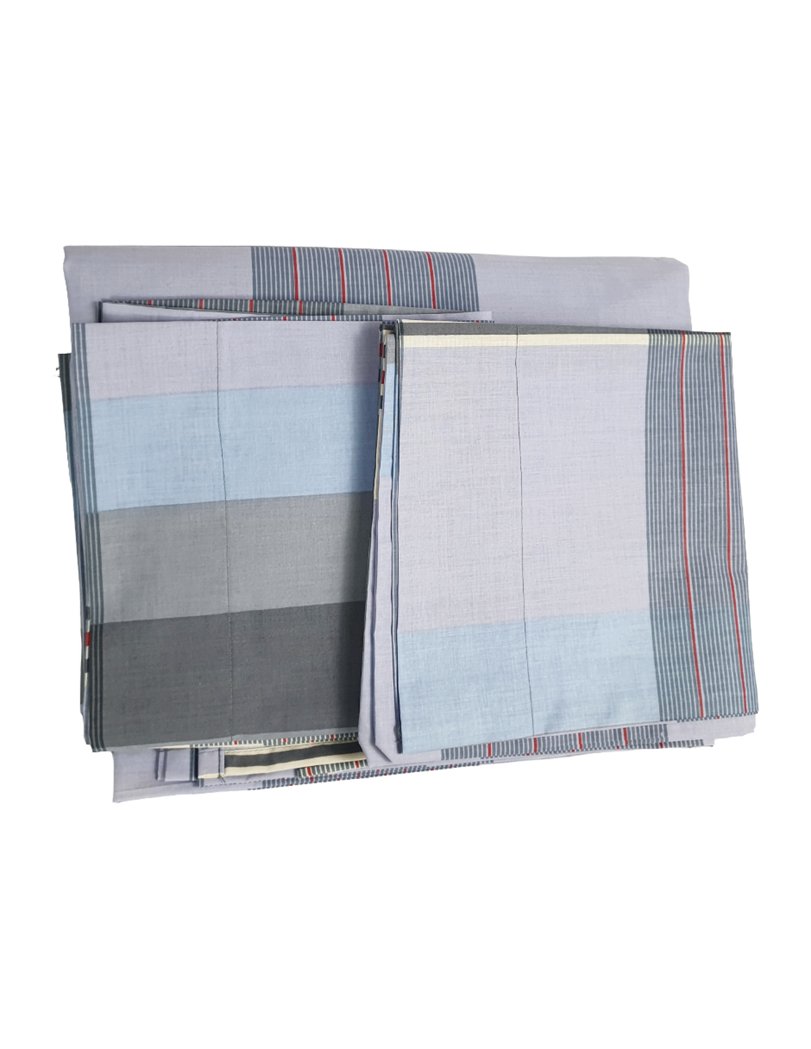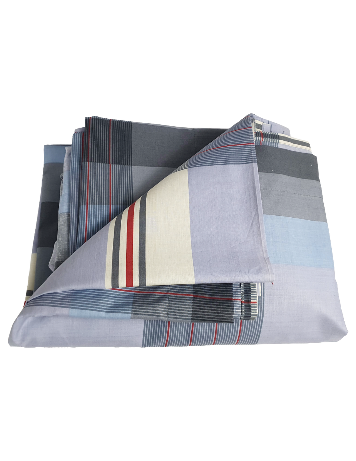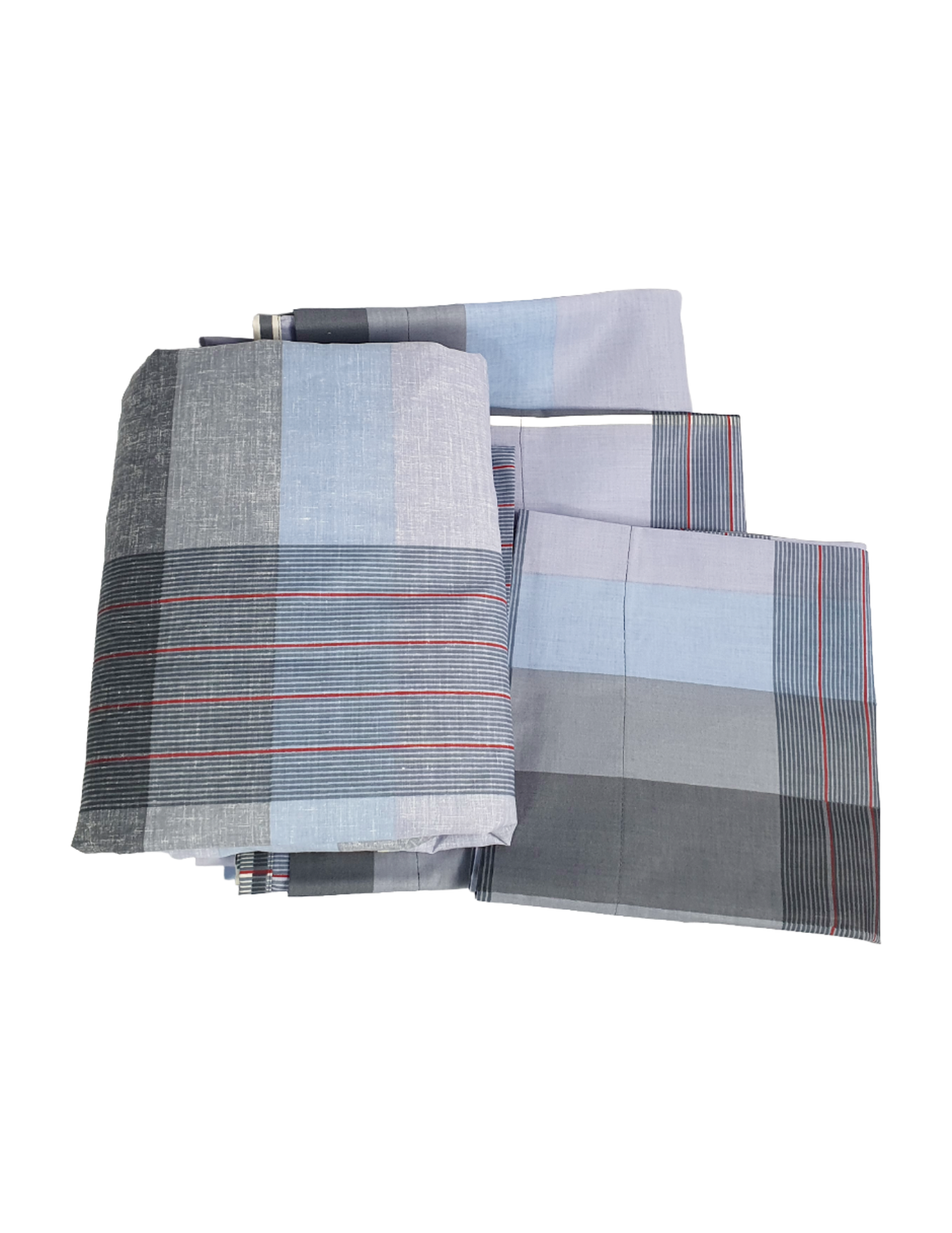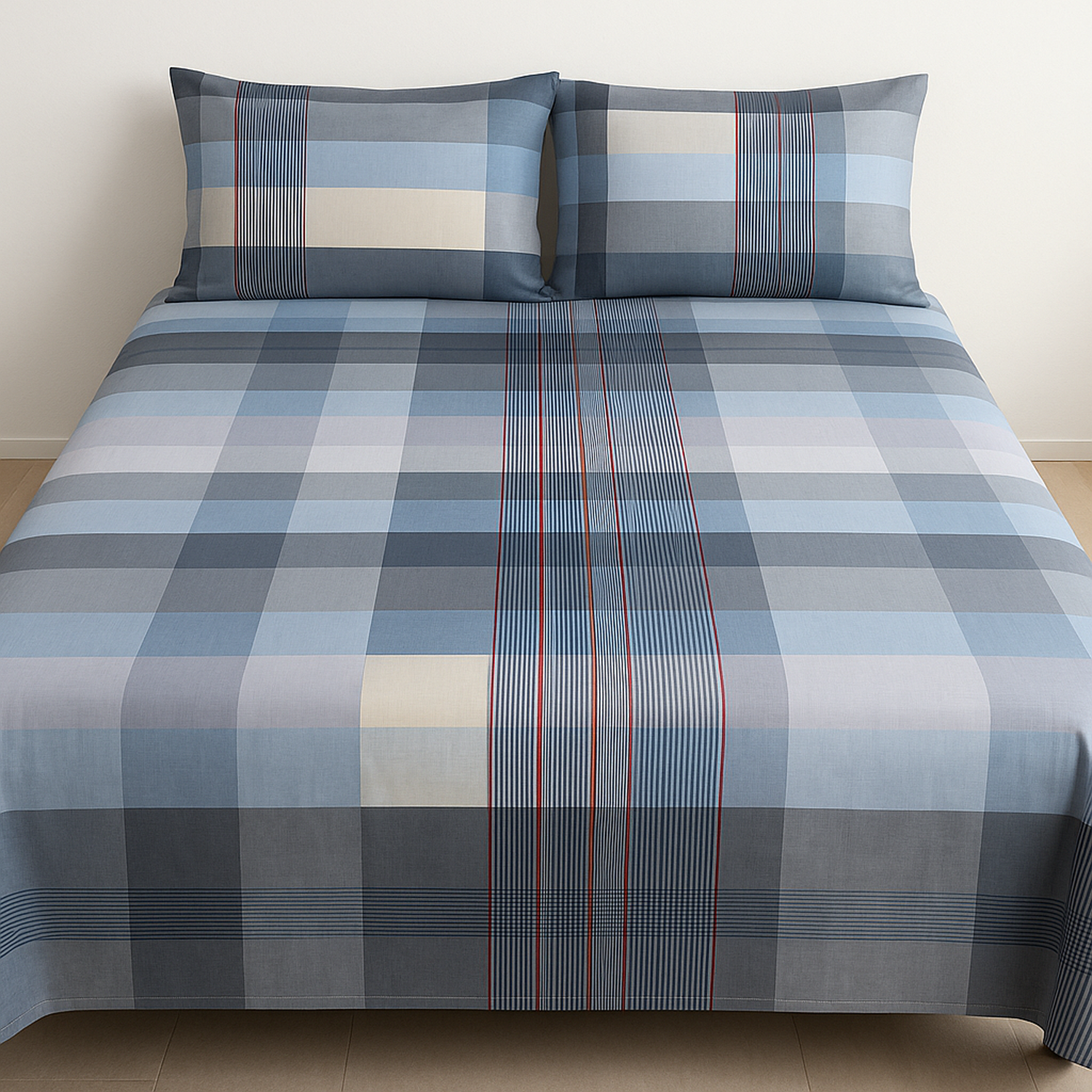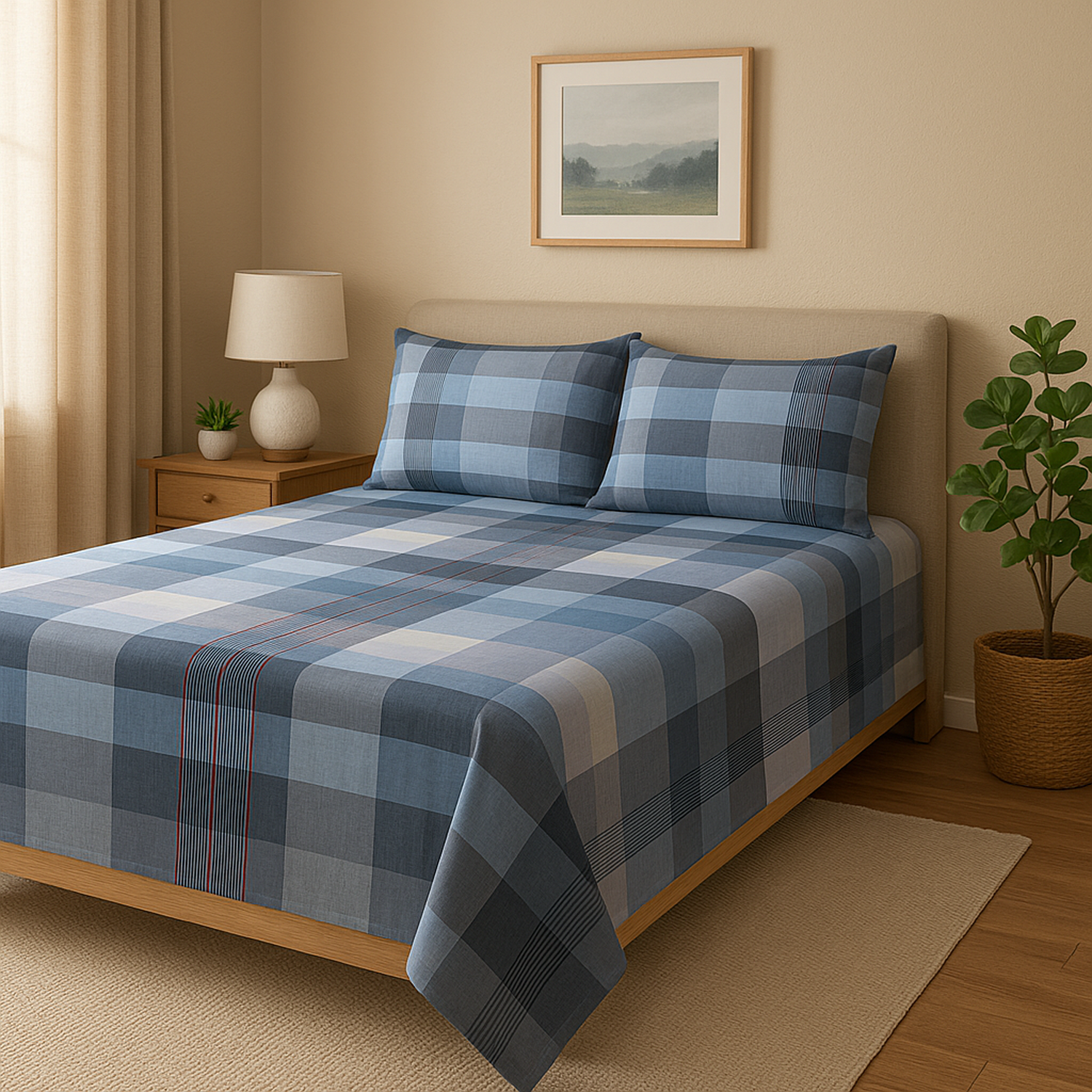 Juego de sábanas King Size en color azul a cuadros, confeccionado con tela de 200 hilos 100 % algodón, que ofrece una textura suave, fresca y resistente para uso diario. El set incluye una sábana plana, una sábana con cajón y dos fundas para almohada King Size. Ideal para hogares, hoteles y departamentos en renta que buscan calidad hotelera y confort superior. Diseñado por Almoda, experto en textiles y blancos de alta calidad.