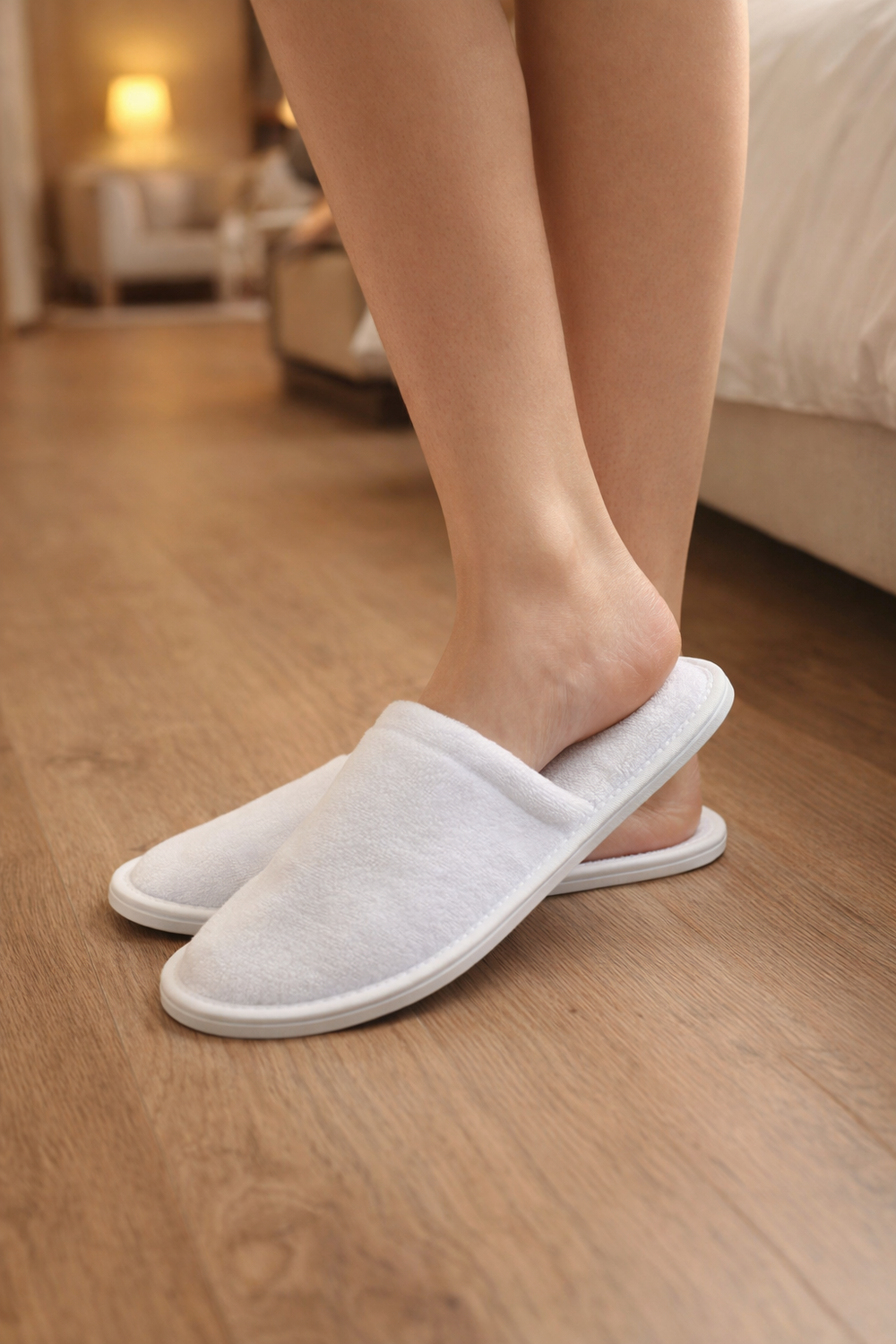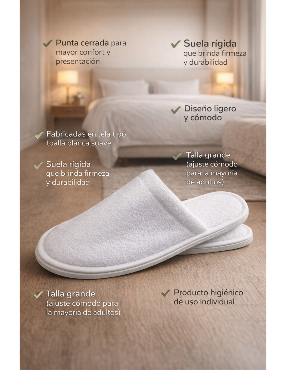 Brinda a tus huéspedes o clientes una experiencia de confort y presentación profesional con estas pantuflas hoteleras de punta cerrada. Fabricadas en tela tipo toalla blanca suave al tacto y con suela rígida, ofrecen comodidad, higiene y durabilidad para uso individual.